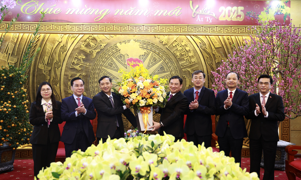 | Đồng chí Nguyễn Việt Oanh cùng đoàn công tác tặng hoa, động viên Đảng bộ, chính quyền và nhân dân TP Bắc Giang nhân dịp đầu năm mới. |